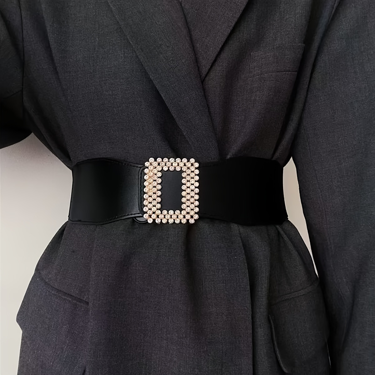 TEMU 여성용 우아한 스퀘어 버클 벨트 - 골드톤 또는 블랙 버클, 화이트/블랙/베이지/그레이/네이비 - 드레스, 재킷, 코트에 다양하게 활용 가능 - 웨딩, 파티, 캐주얼 의상 - 편안하고 내구성 있는 벨트, 여성용 우아한 벨트, 플러스 사이즈 드레스용 와이드 벨트, 장식용 벨트, 드레스용 고급 탄성 벨트, 여성용 우아한 벨트