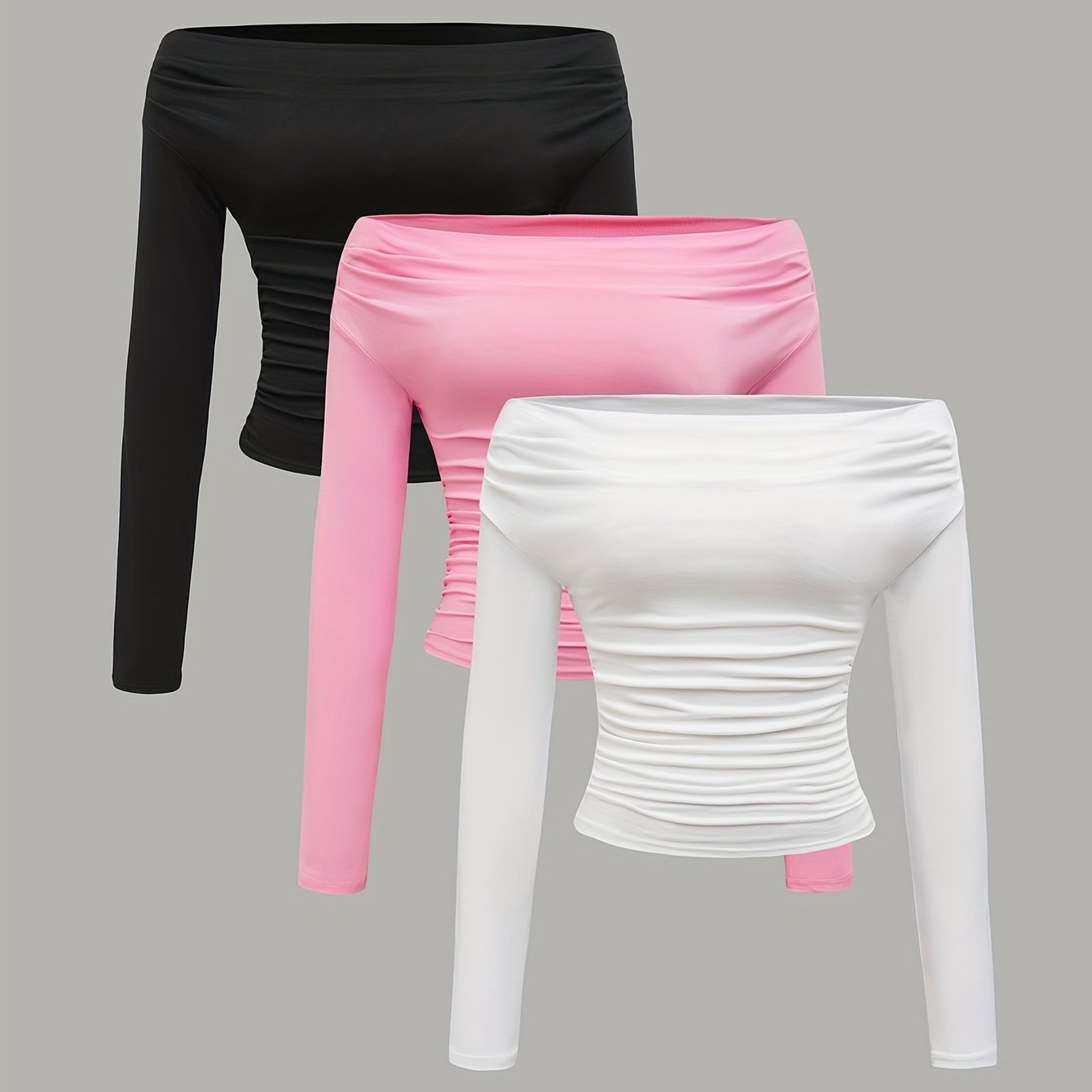 TEMU 봄과 가을에 적합한 세 개의 캐주얼 단색 컬러 오프숄더 플리츠 피팅 셔츠입니다.