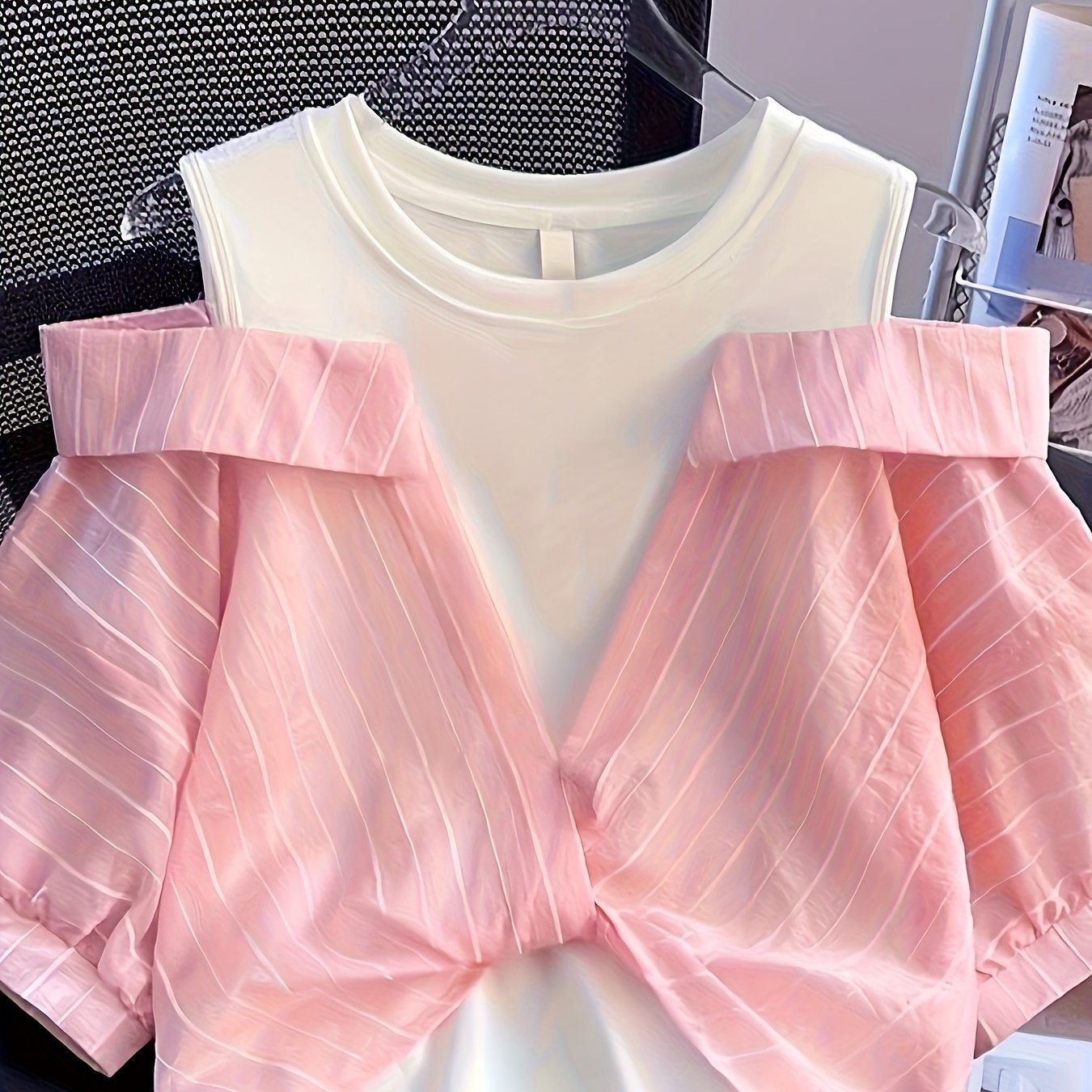 TEMU 여성용 스타일리시 페이크 투피스 반팔 셔츠, 신상 여름 컬렉션, 트렌디 루즈핏 크롭 오프숄더 탑