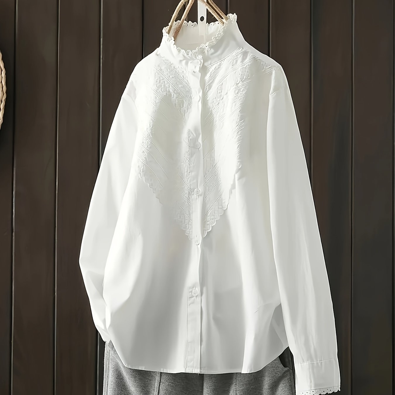 TEMU 여성용 우아한 화이트 러플 트림 칼라 블라우스 - 롱 슬리브 루즈핏 버튼 프론트 셔츠, 단색 봄/여름 탑, 웨딩, 오피스 & 특별 이벤트용, 세탁기 사용 가능 (스트레치 없음) - 우아한 컬렉션 디자인|여름블라우스