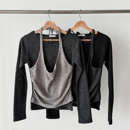 [다잇템][다잇템] 여성 잔주름 홀터탑 리본 나시와 롱슬리브티 세트_23626661_588872