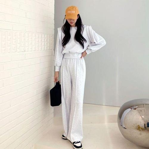 [유야]면 무지 퍼프 맨투맨 와이드팬츠 트레이닝 세트 츄리닝 꾸안꾸 셋업 -PST0123H- 빅사이즈 루즈핏 ..