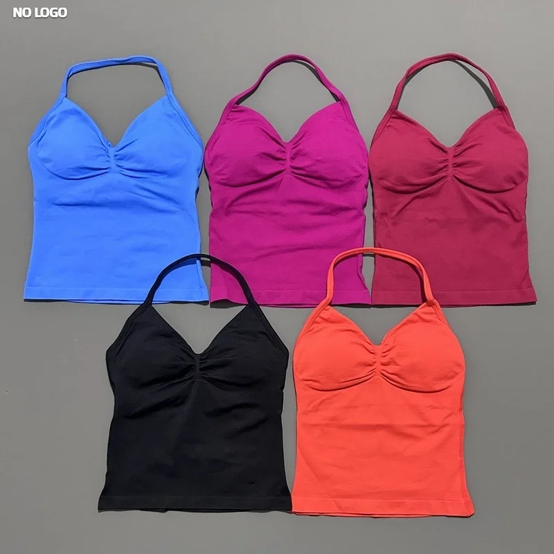 로고 없는 여성용 홀터탑 롱라인 스트랩 탱크 패드 요가복 피트니스 러닝 액티브웨어 짐 운동 상의