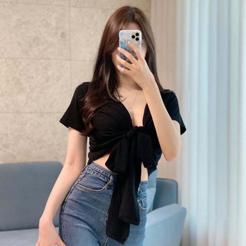 [셀럽하우스]20대 YYSN4283 여성 유니크한 랩 브이넥 티셔츠 여행 데이트룩