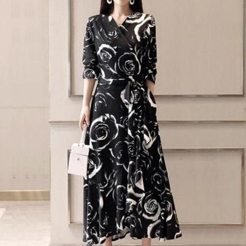 [엄지척]여성 가을 간절기 브이넥 쟈가드 장미 랩 롱 원피스_19861412_667501