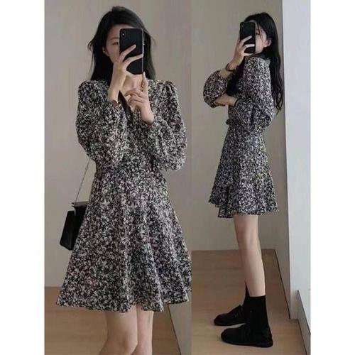 [위시드]플라워 셔링 랩 소매 퍼프 롱 원피스 (WIAAOP091)