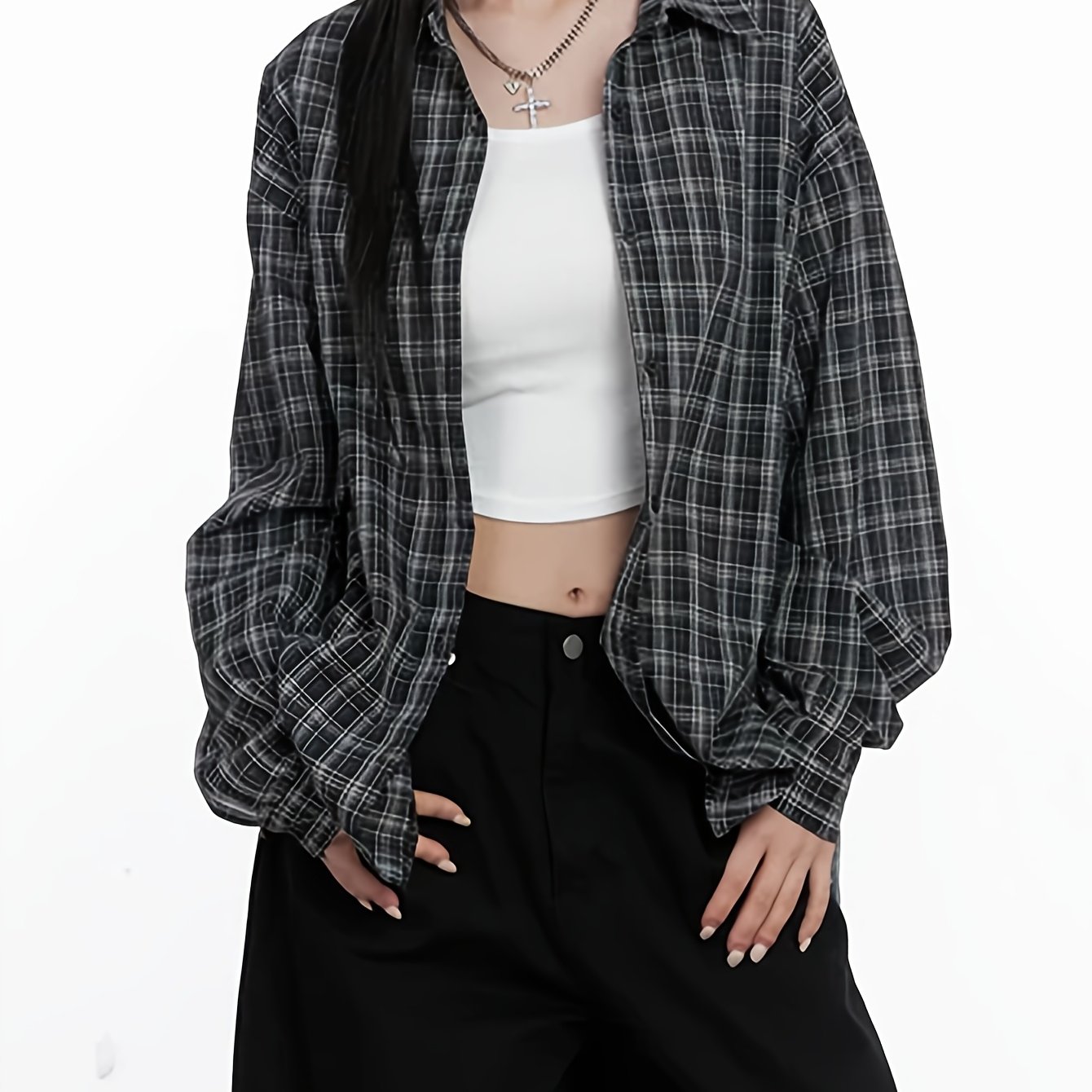 TEMU 클래식 발렌타인데이 체크 무늬 블랙 앤 그레이 루즈핏 긴팔 셔츠, 트렌디한 스트리트 스타일, 블랙 앤 그레이 체크 레이어드 셔츠, 활용도 높은 루즈핏 긴팔 칼라 탑, 스트리트 패션 레이어링 셔츠
