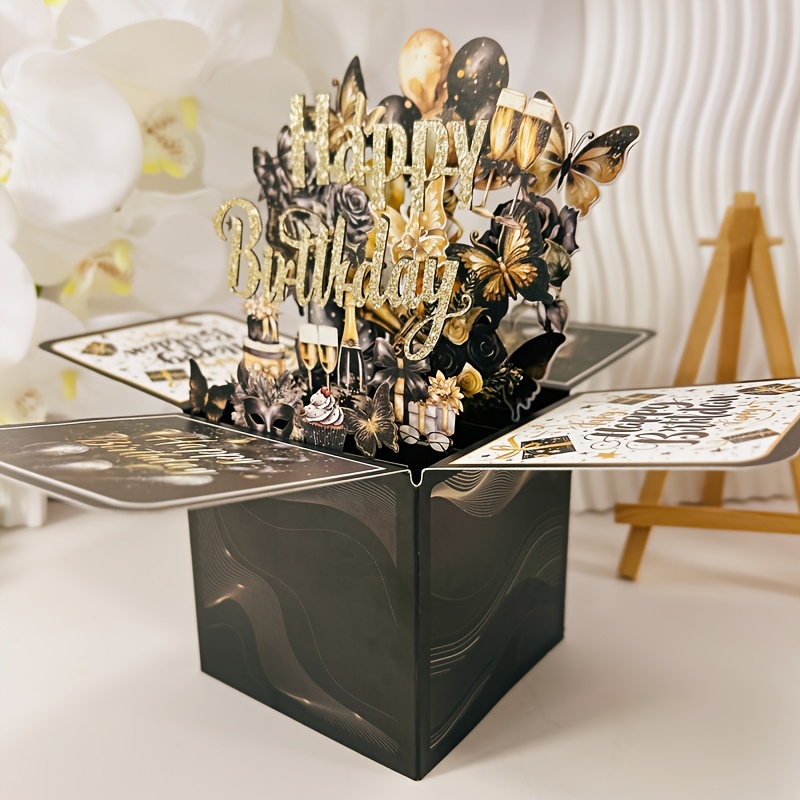 TEMU 1pc 글램 스타일 블랙 골든 3D 팝업 생일 카드 - 남성과 여성에게 설 데이 인사 카드 세트,velop 포함