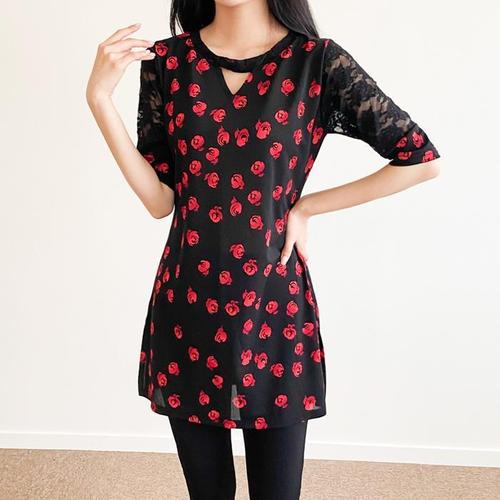 까르죠아 레드 장미 롱 블라우스 미시여성의류 섹시 티셔츠 여름 칠부