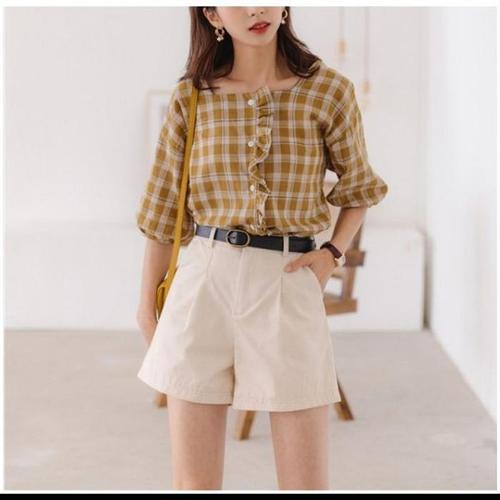 [오노마] ONM 스퀘어넥 프릴 블라우스 레드 체크 옐로우그린