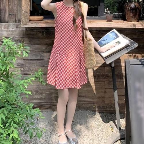 [엄지척]사선 체크 핀턱 절개 민소매 레드 원피스_19912570_667501