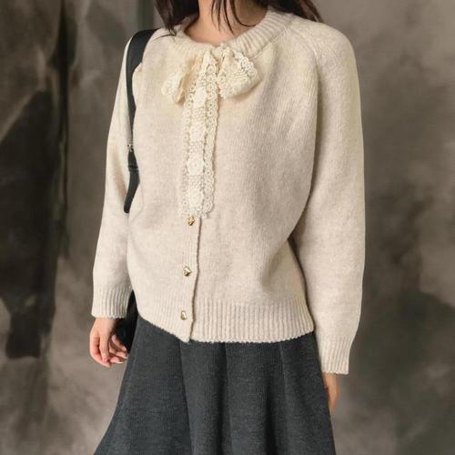 [옷자락]여성 사랑스러운 레이스 리본 울 버튼 니트 가디건