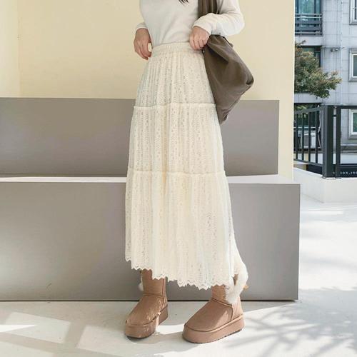 여성 레이스 플리츠 캉캉 밴딩 롱 스커트 여자 치마