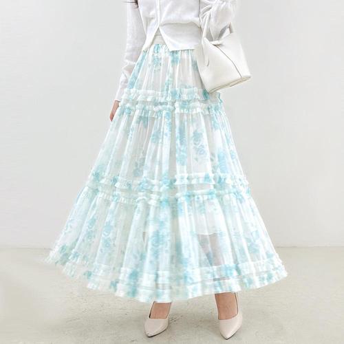 [드리다]여름 수채화 플라워 프린팅 패턴 빅사이즈 레이스 캉캉 맥시 롱 스커트 미시 캐주얼