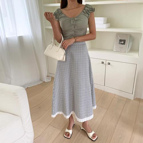 여자 잔잔체크 에이라인 롱 밑단레이스 스커트