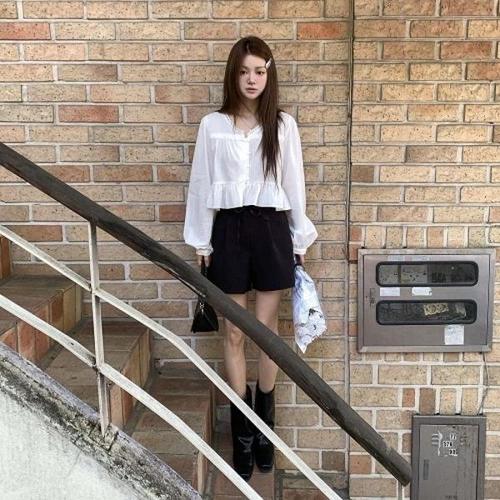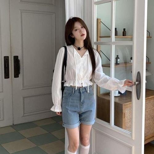 [신상오픈런]|KHH41AD|여성 레이스 긴팔 크롭 블라우스 코튼 스트랩 찰랑핏