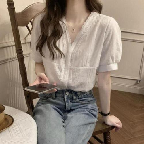 [다잇템][다잇템] 여자 벌룬소매 면원단 귀여운 레이스 반소매 블라우스_22388814_588872