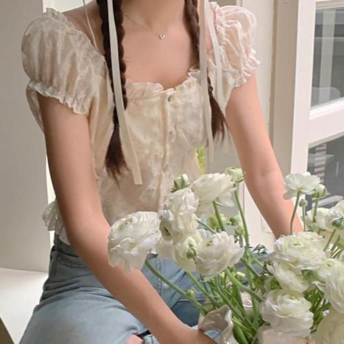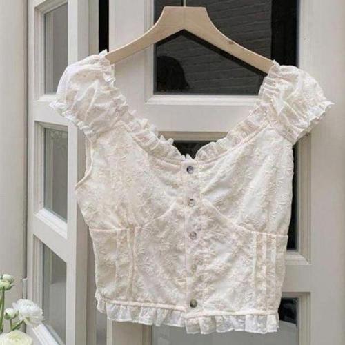 [신상오픈런]여성 화이트 레이스 퍼프 소매 물결형 반팔 티셔츠