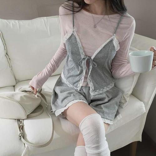 여성 코디 골지 레이온 귀여운 레이스 베스트