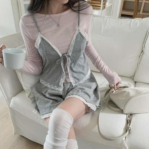 |CMD265A|여성 니트 레이스 베스트와 면 반팔 티셔츠 세트