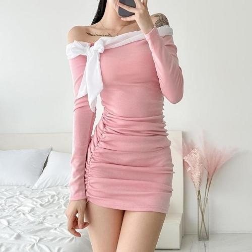 [신상오픈런]|KMO412F|냐레피 원피스 스카프 배색 여성 오프숄더 미니 주름디테일_18170050_597559