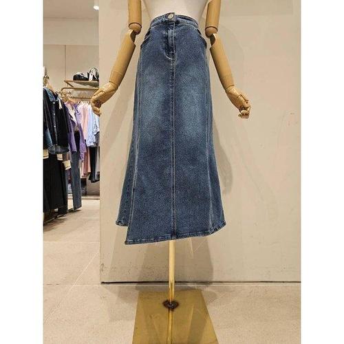 [샵앤]여성 허리밴딩 밑단레이스 H라인 뒤트임 롱스커트 21DS-WSK-4911-진청