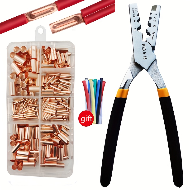 TEMU 250개 GT 구리 연결 파이프 와이어 조인트 소형 구리 튜브 터미널 케이블 러그 부트레이스 페룰 키트 (압착 플라이어 포함)