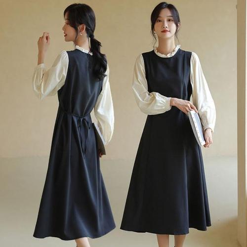여성 레이어드 니트 원피스 / 배색 프릴 플레어 원피스, 로맨틱 데일리룩