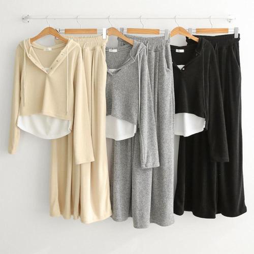 [옷자락] 여자 레이어드 버튼 크롭 후드티 핀턱 와이드팬트 세트