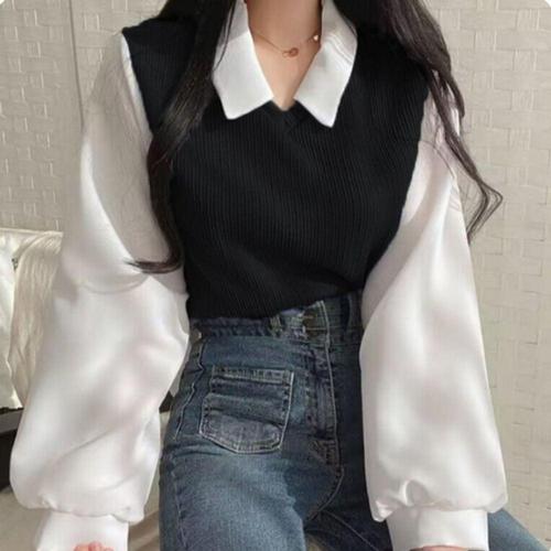 여성 페이크 레이어드 블라우스 1P 니트 카라 티셔츠 WFK2BTB