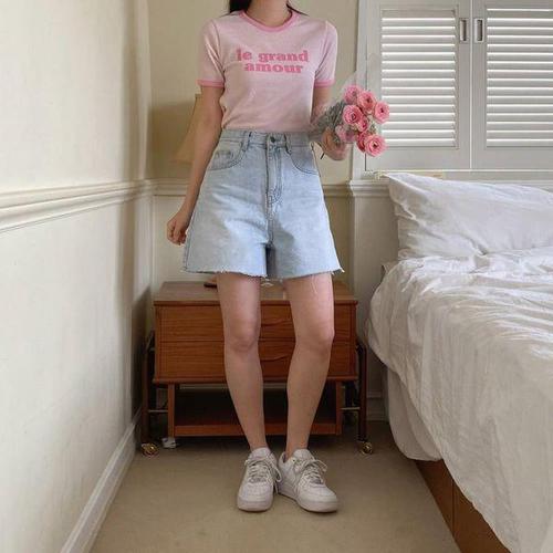 [신상오픈런]여성용 레이온 혼합 스판 컬러 배색 레터링 와플 티셔츠