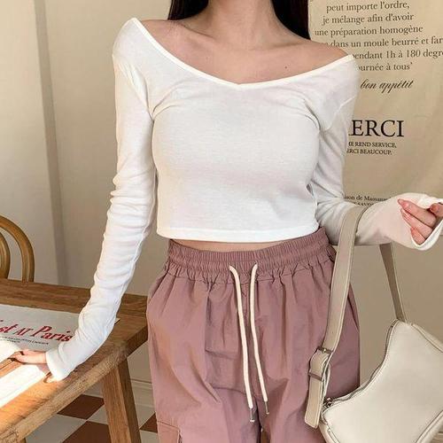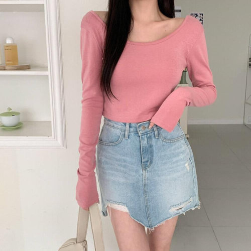 [신상오픈런]여성용 심플 레이온 스판 골지 유넥 크롭 긴팔 티셔츠