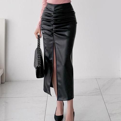 [옷자락] 여자 겨울 시크 연말 셔링 레더 앞트임 맥시 롱스커트