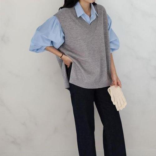 [옷자락]여성 사무실룩 커버업 루즈핏 사이드슬릿 언발 브이넥 니트조끼