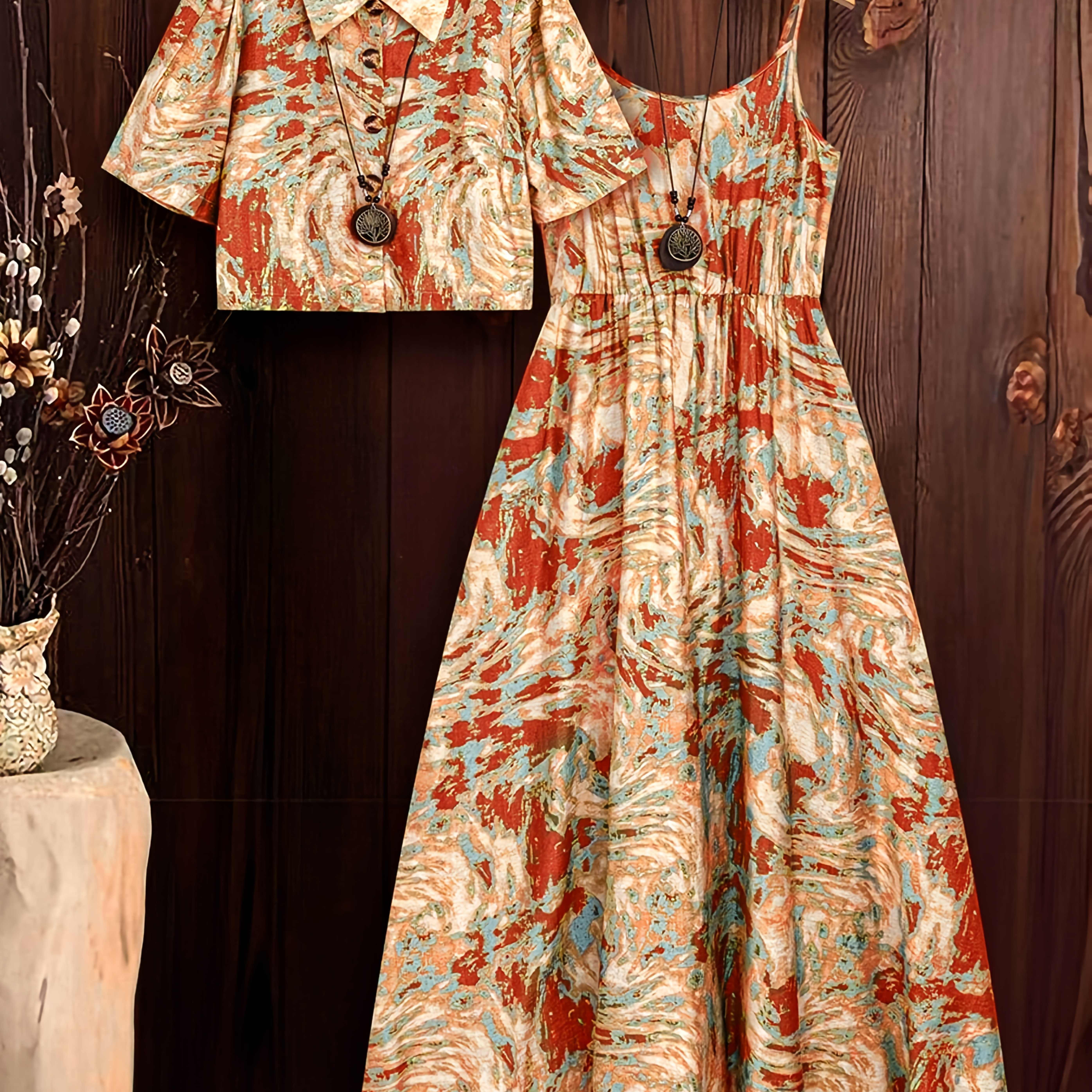TEMU 여성용 홀치기 염색 프린트 반팔 셔츠 & 탱크 탑 드레스 캐주얼 세트