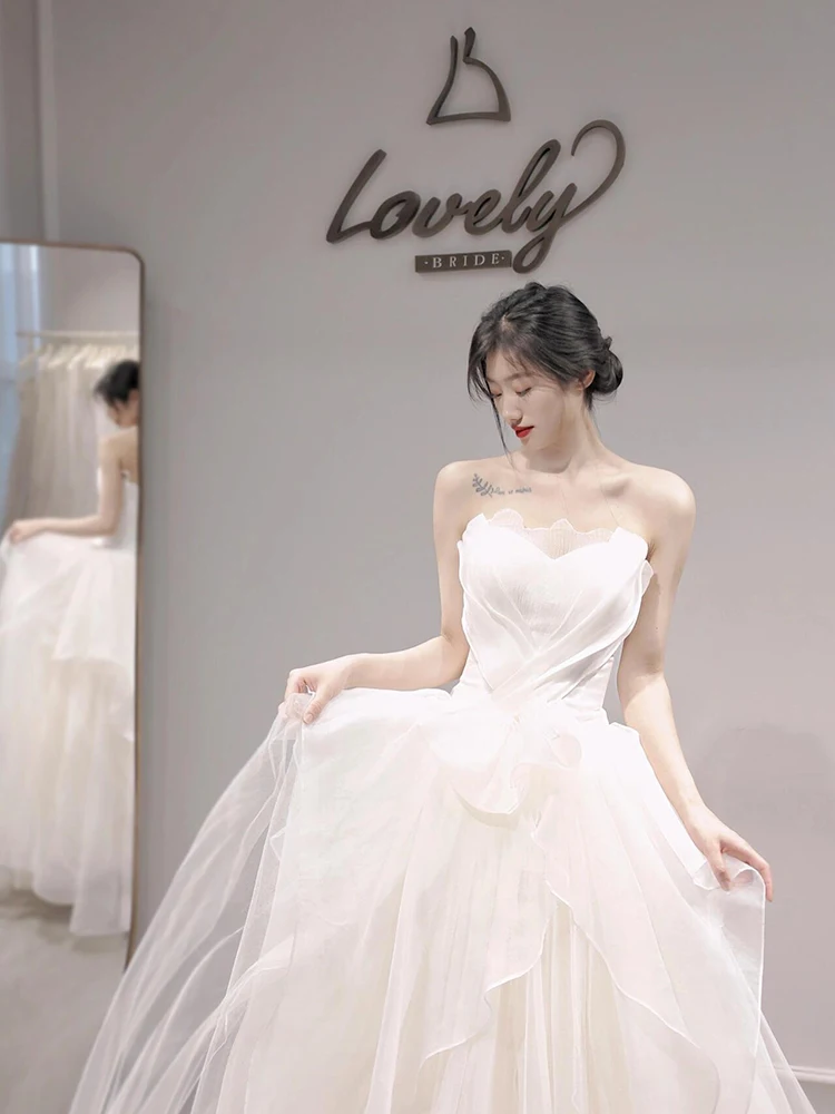 심플한 웨딩드레스 2025 신상 웨딩드레스 한국 스타일 레이스 원단 민소매 버슬 백리스 야외 여행 촬영용