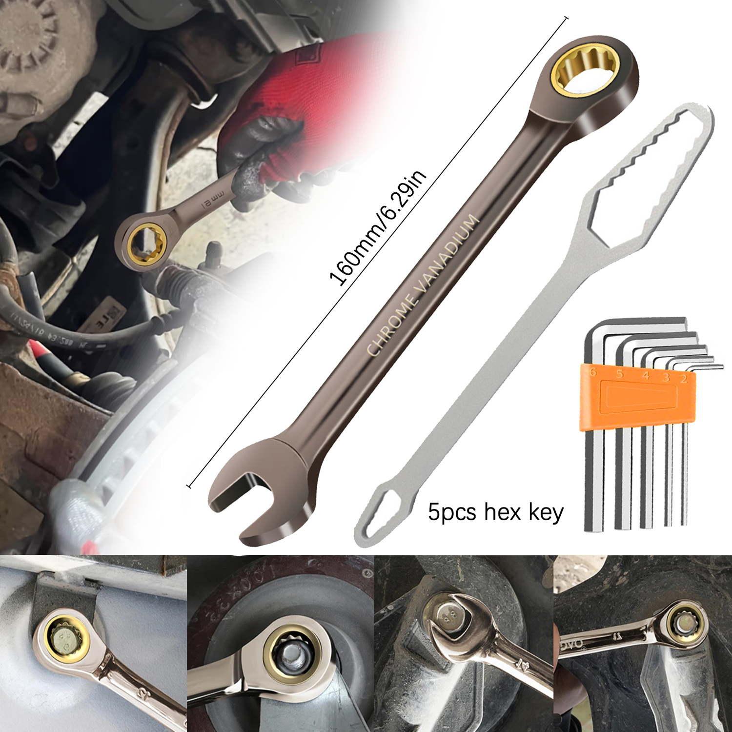 TEMU 7피스 - 도금 래칫 헤드 렌치 세트, 도금 마감, 72톱니 래칫, 크롬 바나듐 강철, 인체공학적 그립, 더블엔드 렌치 1개, 멀티펑션 렌치 1개, 헥스 렌치 5개 포함, DIY 하드웨어 도구, 수공구, 홈 수리 도구, 자동차 수리 도구