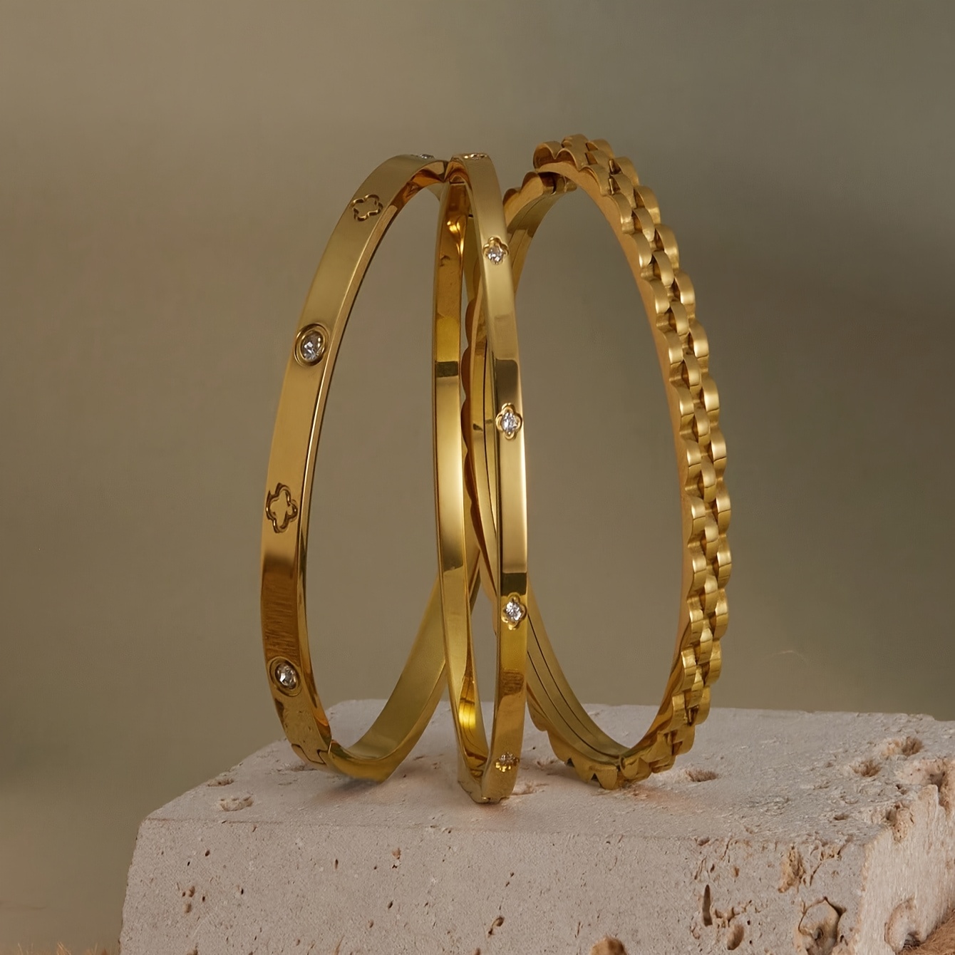 TEMU 3개 골드 304 304 스테인리스 스틸 팔찌 세트, 변색 방지 클래식 네잎 클로버 커플 팔찌, 패셔너블 여성 주얼리, 라이트 럭셔리 팔찌, 우아한 레트로 저렴한 액세서리, 데일리룩을 위한 스타일리시 팔찌
