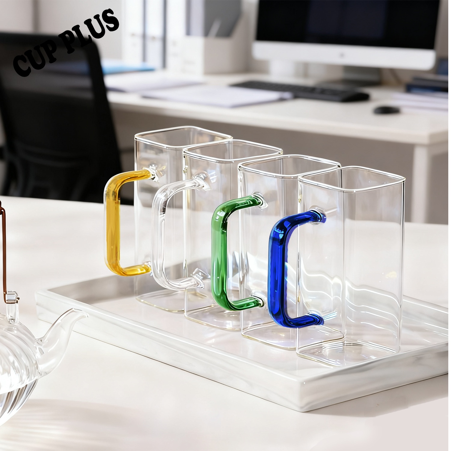 TEMU 4개 세트 멀티 컬러 조합 13.53oz/400ml 투명 붕규산 유리 컵 (블루 핸들 포함) - 내열 및 냉각 저항, 재사용 가능한 사각 머그컵 (커피, 우유, 주스, 탄산 음료용) - 가정 또는 사무실 사용에 적합, 커피 컵 세트