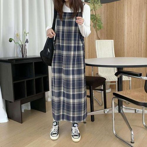 [신상오픈런]여성 체크 롱 원피스 사이드 셔링 뷔스티에 스타일