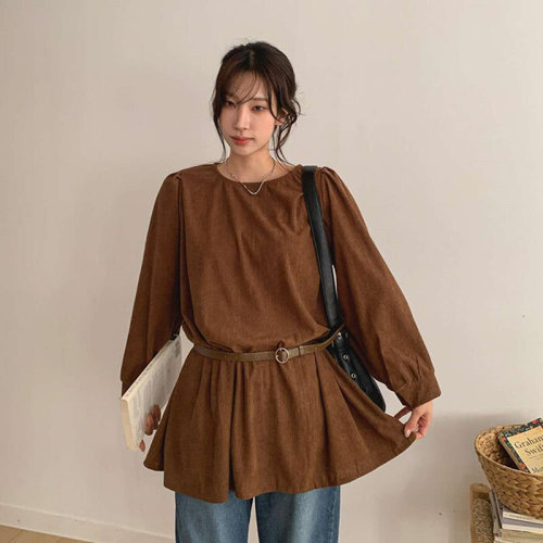 [옷자락] 여성 코듀로이 라운드넥 롱티 벨트 세트 미니 원피스