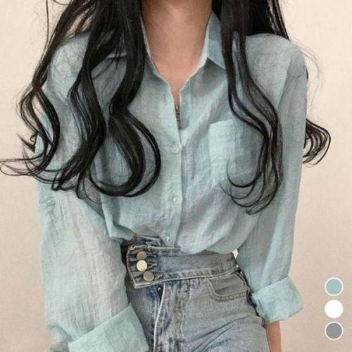 [펠리체조수니]셔츠카라 시스루 롱 블라우스 FLMB219
