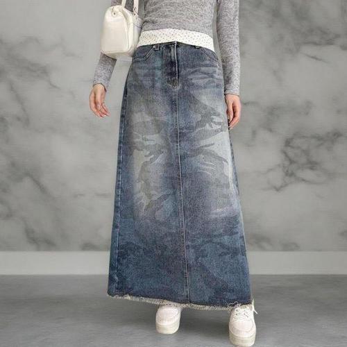 [옷자락]여성 힙무드 카모 워싱 청 트임 롱 스커트