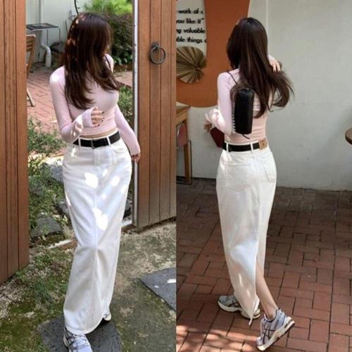 앞트임 롱 데님 스커트 여성 긴치마 데님치마 슬릿스커트 WFNQKH6