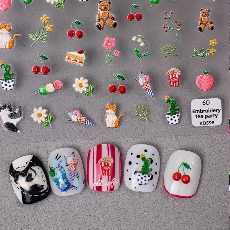 TEMU 여성과 소녀들을 위한 자기 접착식 네일 아트 용품, 키튼 복숭아 케이크 디자인이 있는 6D 각인 네일 아트 스티커, 케이크 체리 열대 식물 네일 아트 스티커