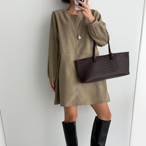 [에이치플러스몰]퓨링원피스 A라인 미니 긴팔 무지 루즈 데이트 파티