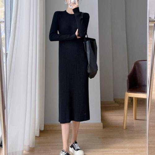 MINA STYLE 브이넥 원피스 니트 롱 옆트임 여성 긴팔 데일리룩