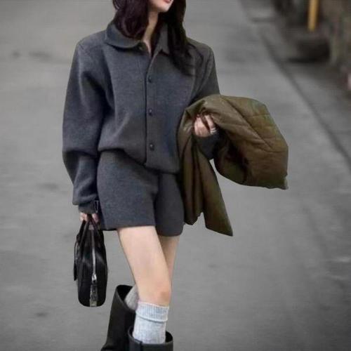 [신상오픈런]여성용 루즈핏 카라넥 버튼 가디건 및 반바지 세트