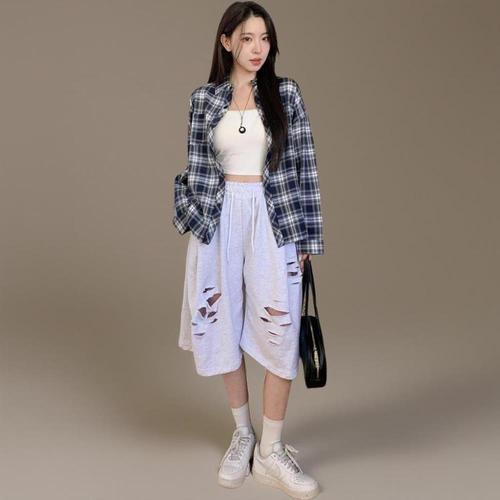 |KMP9365|여성 루즈핏 와이드 쭈리 면혼합 데미지 반바지