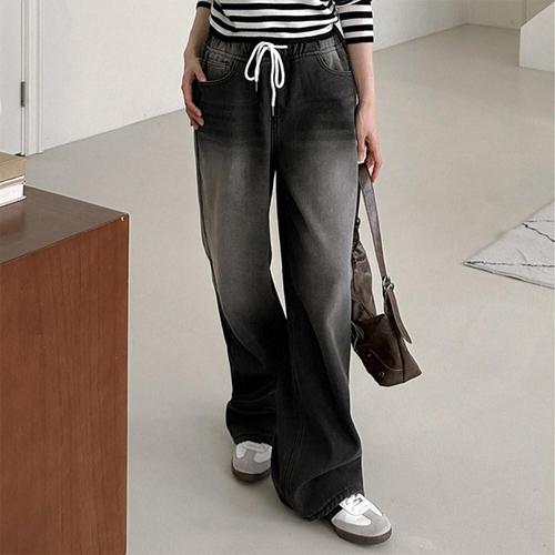 [옷자락] 여자 털안감 워싱데님 루즈핏 밴딩 와이드핏 청바지